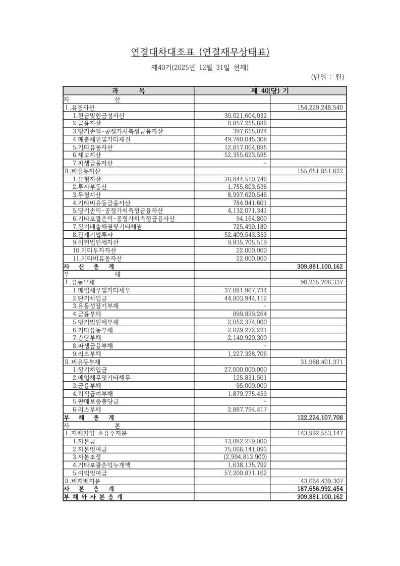 Á¦40±â ´ëÂ÷´ëÁ¶Ç¥(À繫»óÅÂÇ¥) °ø°í